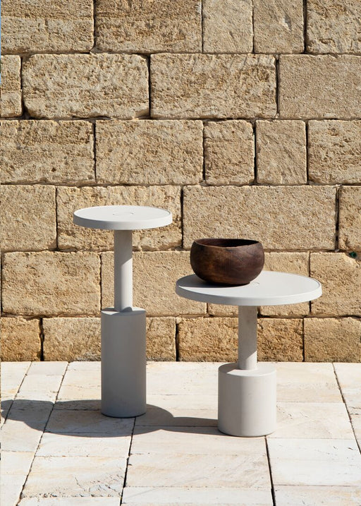 BaxterDotati di una solida colonna di sostegno che termina con una base progressivamente più ampia e piani d'appoggio circolari, il tavolino presenta una...