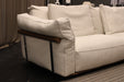 Camelot presenta un interessante contrasto tra il rigore formale della struttura costituita da staffe in metallo e da una barra cilindrica in cuoio e l’accogliente morbidezza degli elementi imbottiti. I cuscini di schienale sono caratterizzati da dimensioni importanti e avvolgenti imbottiture in piuma d’oca che invitano ad abbandonarsi al relax.